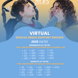 Virtual Special Needs Support groups FOR CAREGIVERS OF CHILDREN WITH DISABILITIES Wednesdays at 7:30 PM FOR CAREGIVERS OF ADULTS WITH DISABILITIES Mondays at 7:30 PM Contact: weitzmanlaura@gmail.com to join If there is a change in the date of the meeting, members will be notified.