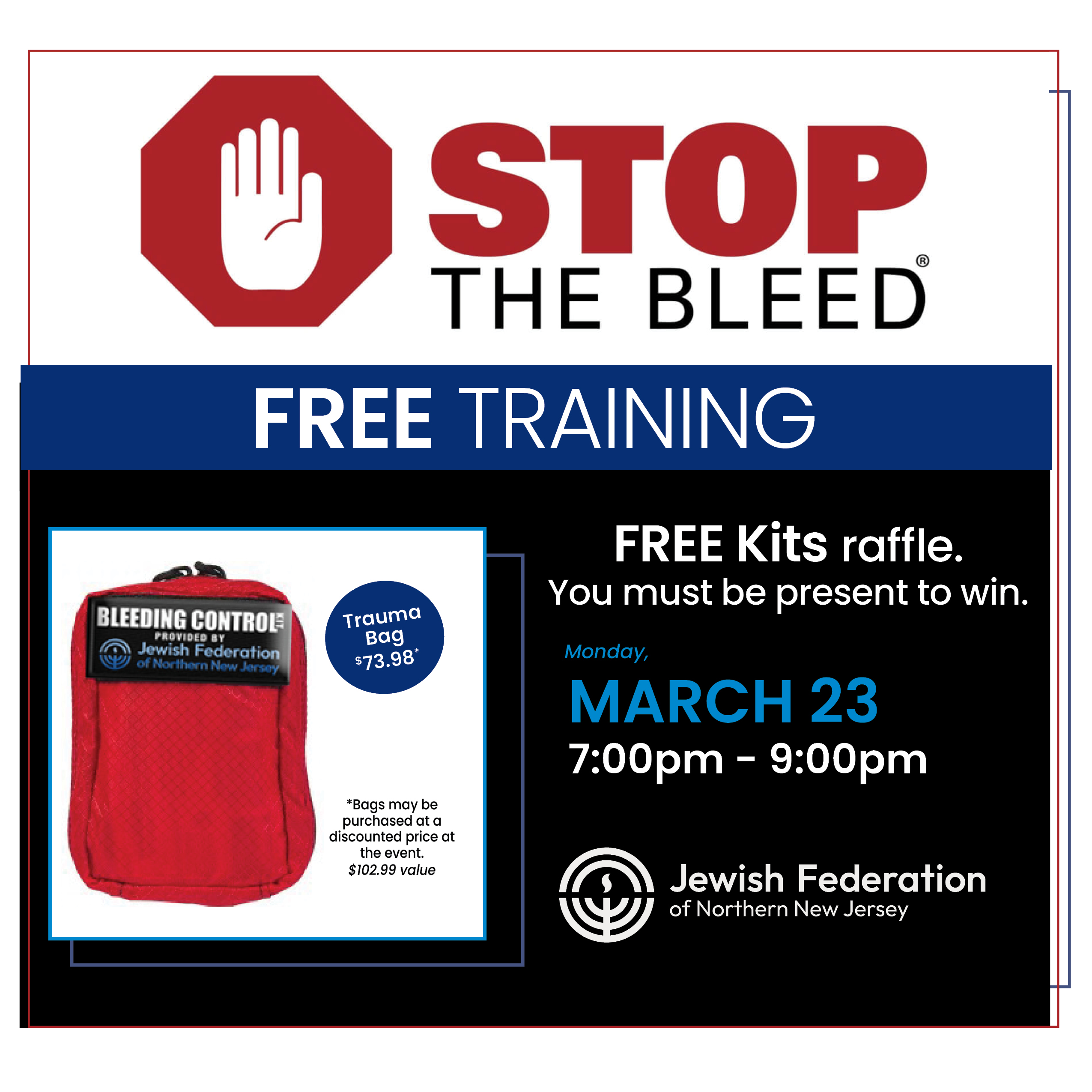 Home Events - Jewish Federation of Northern New Jersey Jewish Federation Stop The Bleed – Free Training Stop The Bleed – Free Training Register Today! + Add to Google Calendar + iCal / Outlook export The event is finished. Date Mar 23 2026 Expired! Time 7:00 pm - 9:00 pm Location Jewish Federation of Northern New Jersey 50 Eisenhower Drive Paramus NJ 07652 Category Jewish Federation Organizer Stu Conboy Phone 201-8203942 Email StuartC@jfnnj.org Share this event