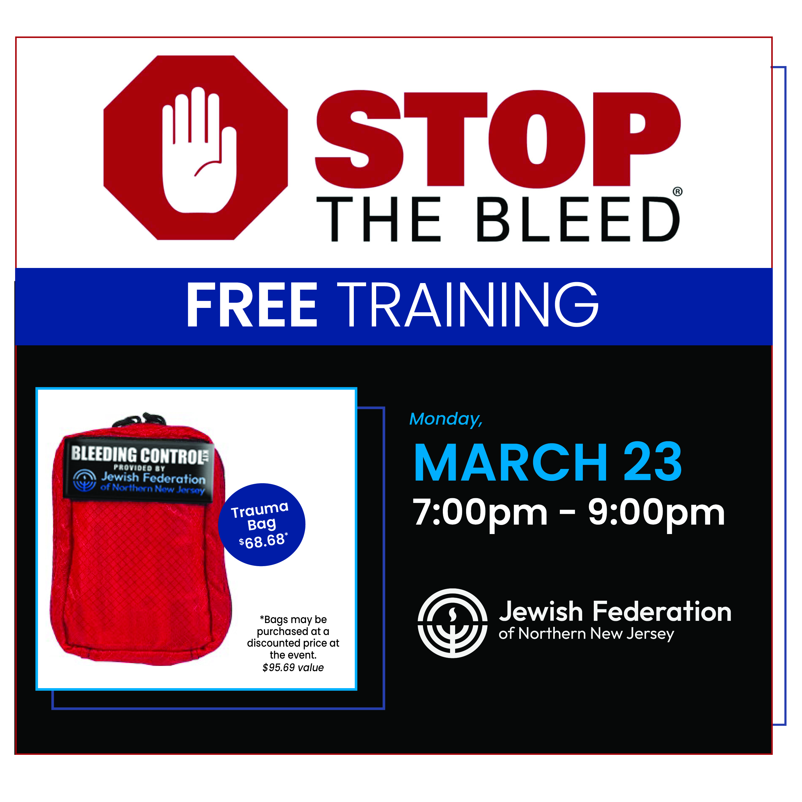 Home Events - Jewish Federation of Northern New Jersey Jewish Federation Stop The Bleed – Free Training Stop The Bleed – Free Training + Add to Google Calendar + iCal / Outlook export 00 days 00 hours 00 minutes 00 seconds Date Mar 23 2026 Time 7:00 pm - 9:00 pm Location Jewish Federation of Northern New Jersey 50 Eisenhower Drive Paramus NJ 07652 Category Jewish Federation Organizer Stu Conboy Phone 201-8203942 Email StuartC@jfnnj.org Share this event