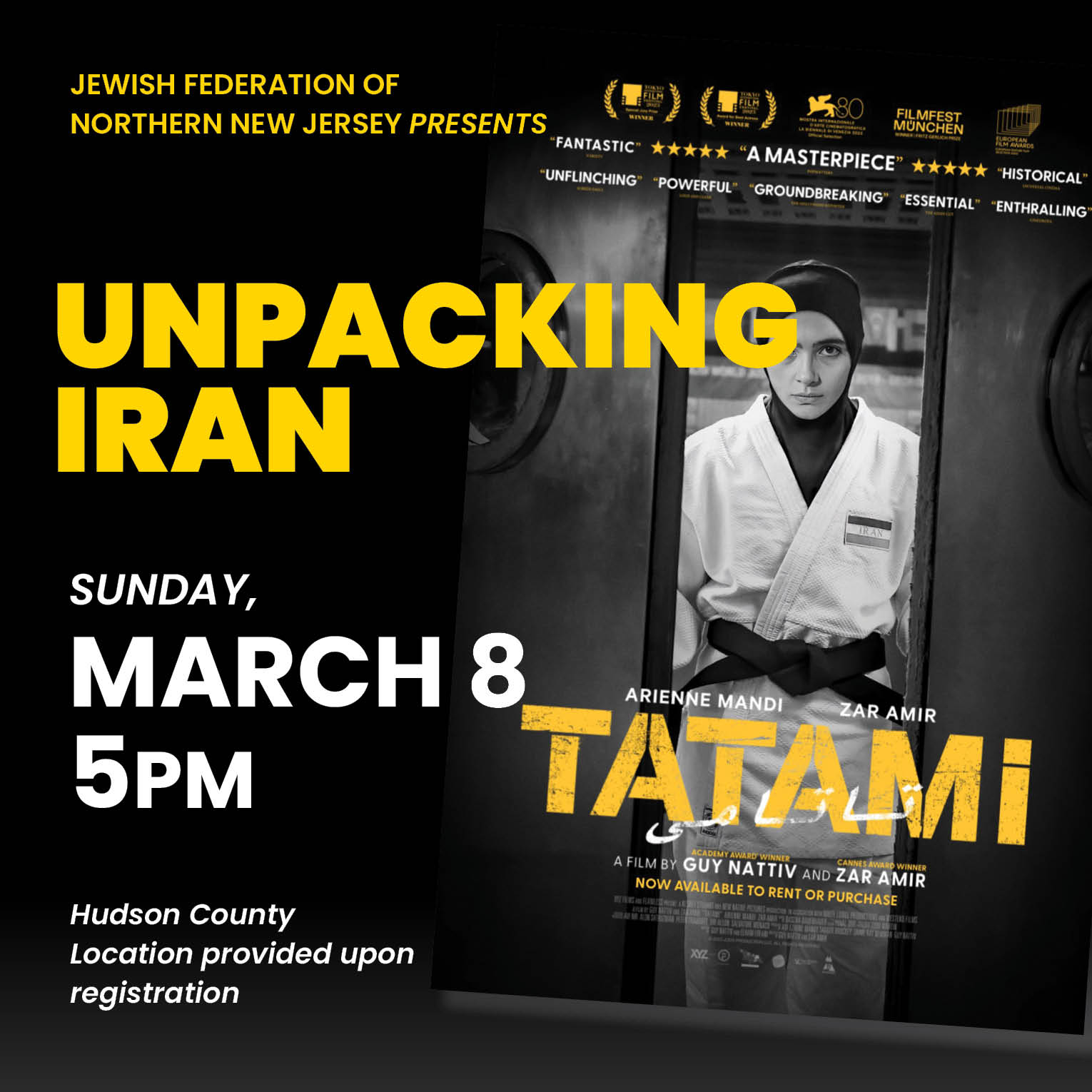 Home Events - Jewish Federation of Northern New Jersey Jewish Federation Unpacking Iran – Hudson Unpacking Iran – Hudson Movie and Speaker showing + Add to Google Calendar + iCal / Outlook export 00 days 00 hours 00 minutes 00 seconds Date Mar 08 2026 Time 5:00 pm - 8:00 pm Category Jewish Federation Share this event